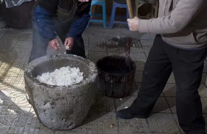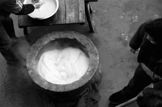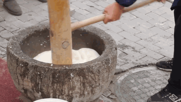 蒸好的米粉了要立马倒入石臼,一定要在米粉还很烫的时候搡捣,如果冷了,做出了的年糕就不好吃了。所谓“搡”,有点像捣药,只不过工具要大许多——大木锤。用力捶打十几斤刚蒸好的米粉团,是打年糕过程中最累人的环节,也是门技术活:打糕师傅需要把锤子举过头顶,全力砸向石臼中的米团,姿势准、力道足,打出的年糕口感才筋道。“主要靠腰力,不掌握窍门的话打个10下就嫌累了。”高爷爷说,打年糕需要两人配合,一人抡锤,另一人需要不断翻叠米团,即“一搡一翻”。