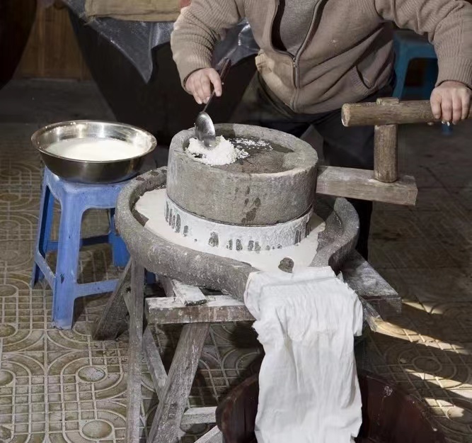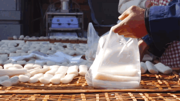 泡米、磨粉、蒸米、制作……随着机器搅拌打揉,一条条年糕被运往传输带上切割成型,这就是现代流水线生产年糕的过程。虽然市场上的年糕大多都被机器制作“取而代之”,但软糯弹牙的手打年糕仍然藏在村子里手艺人的大石臼里。
