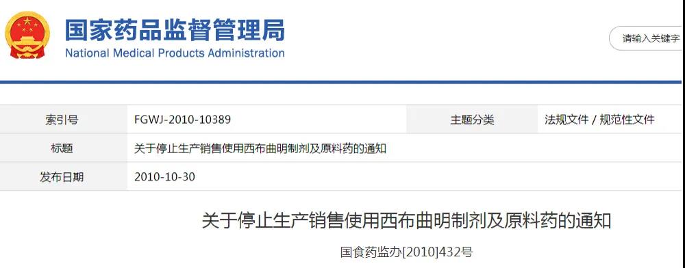 然而,在西布曲明作为减肥药物上市后,不断有使用期间和使用后发生不良反应的报告。2002年起,一项长达6年的上市后研究得出的初步结果认为西布曲明能够增加心血管风险,欧盟、美国等国家的药品监管部门分别采取了暂停上市许可、修改说明书、增加禁忌症等风险管理措施。2010年,美国停止销售西布曲明减肥药。同年10月30日,中国国家食品药品监督管理局决定停止西布曲明制剂和原料药在我国的生产、销售和使用,撤销其批准证明文件,已上市销售的药品由生产企业负责召回销毁,宣告了西布曲明作为减肥药物的终结。