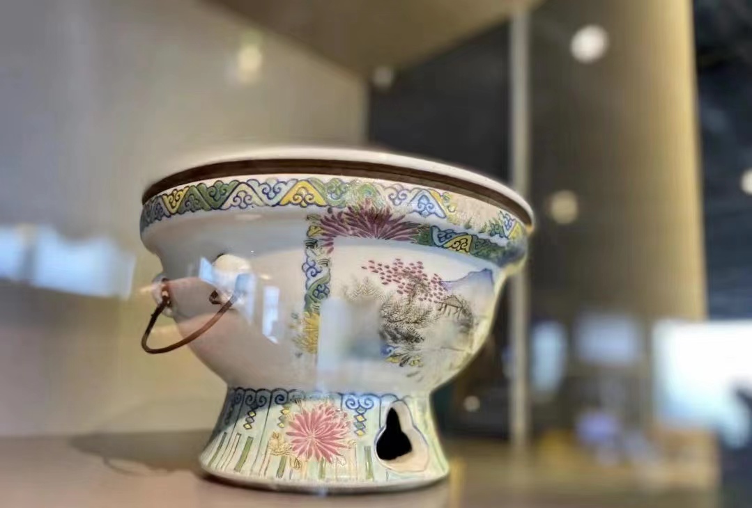 菊花纹开光山水粉彩的瓷器火锅,实在舍不得用来涮羊肉。