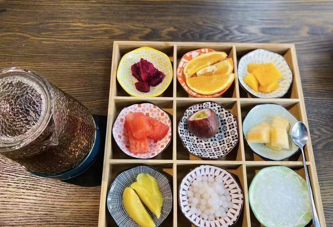 另外,该茶馆考虑到初次前来的年轻朋友的口味,推出了水果茶,并搭配了百香果、黄桃、芒果、西瓜、波波球、椰果等小料。