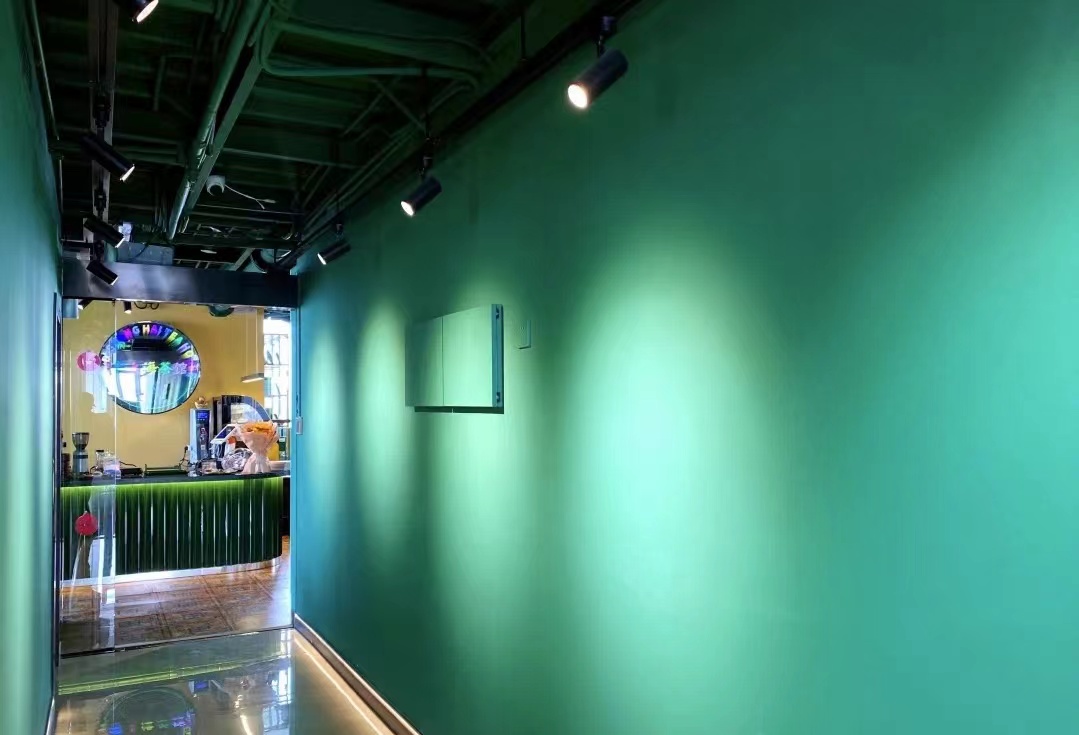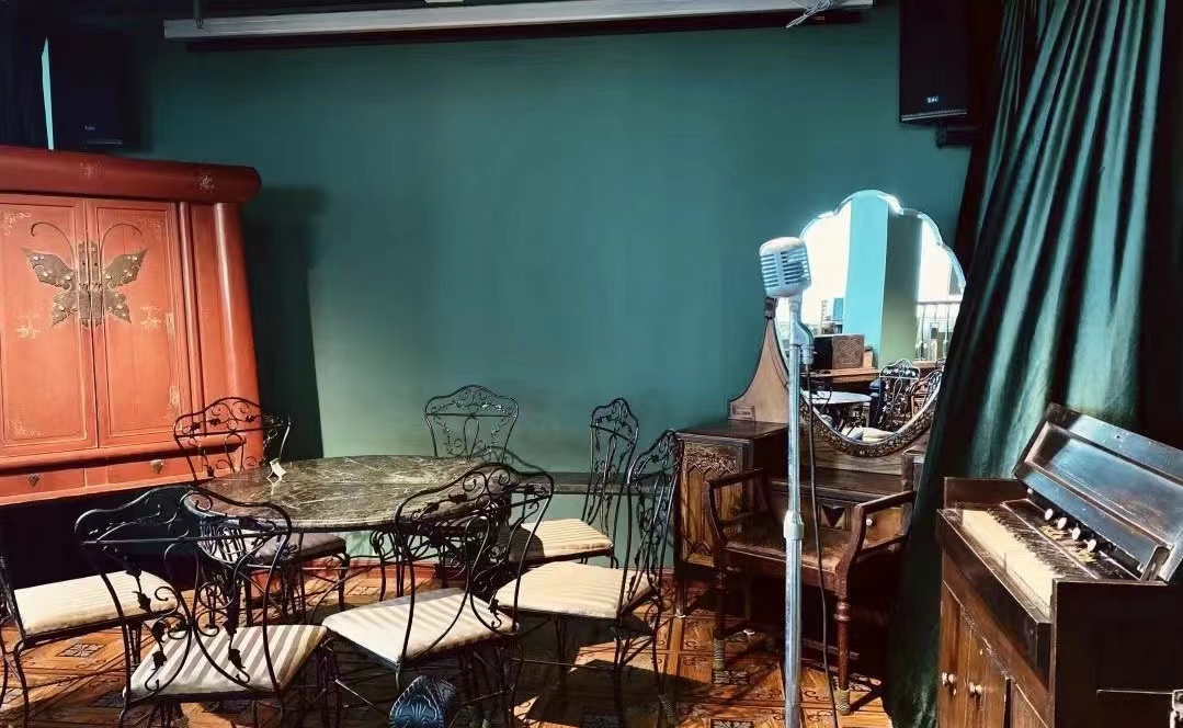 茶馆内整体采用墨绿色调、洋气十足的装修风格,馆内装潢处处流露着复古的老上海风情,绿色皮质沙发、墨绿色墙面,橘黄色温暖灯光点缀着茶馆内摆放着的缝纫机、梳妆台、立式话筒等上海旧时物件。