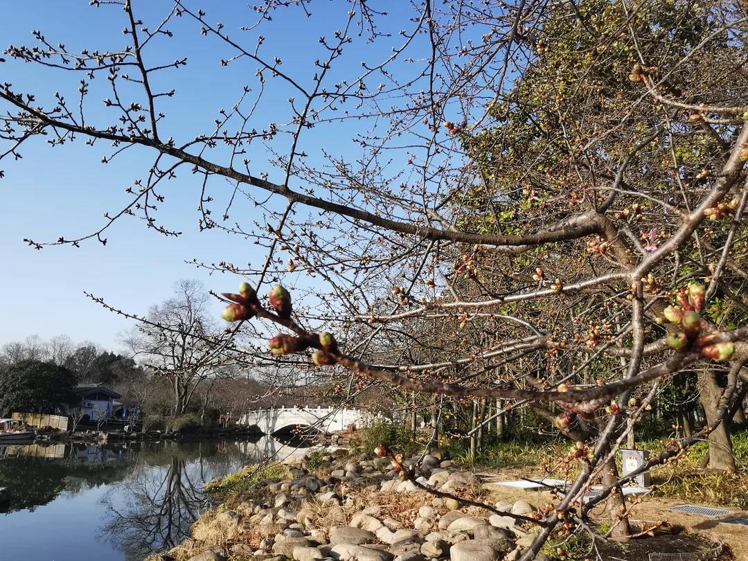 在上海植物园牡丹园的河岸边,三株河津樱已有零星花朵开放,但仔细观察,这些已开放的花朵仍是去年秋冬以来因温湿度适宜提早萌发的花芽,其他大部分的河津樱花芽尚处于现蕾阶段,距离真正进入花期还有一段时日,与去年同期相比,花期有明显的推迟。