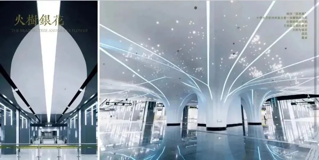 站内设计采用了白色的背景结合LED灯,透明棚顶又将自然光引入,整体非常敞亮。配以智能灯光控制系统,看起来就充斥着满满的科技感!它最引人注意的是装饰了《诸光开物》的一大片艺术墙。