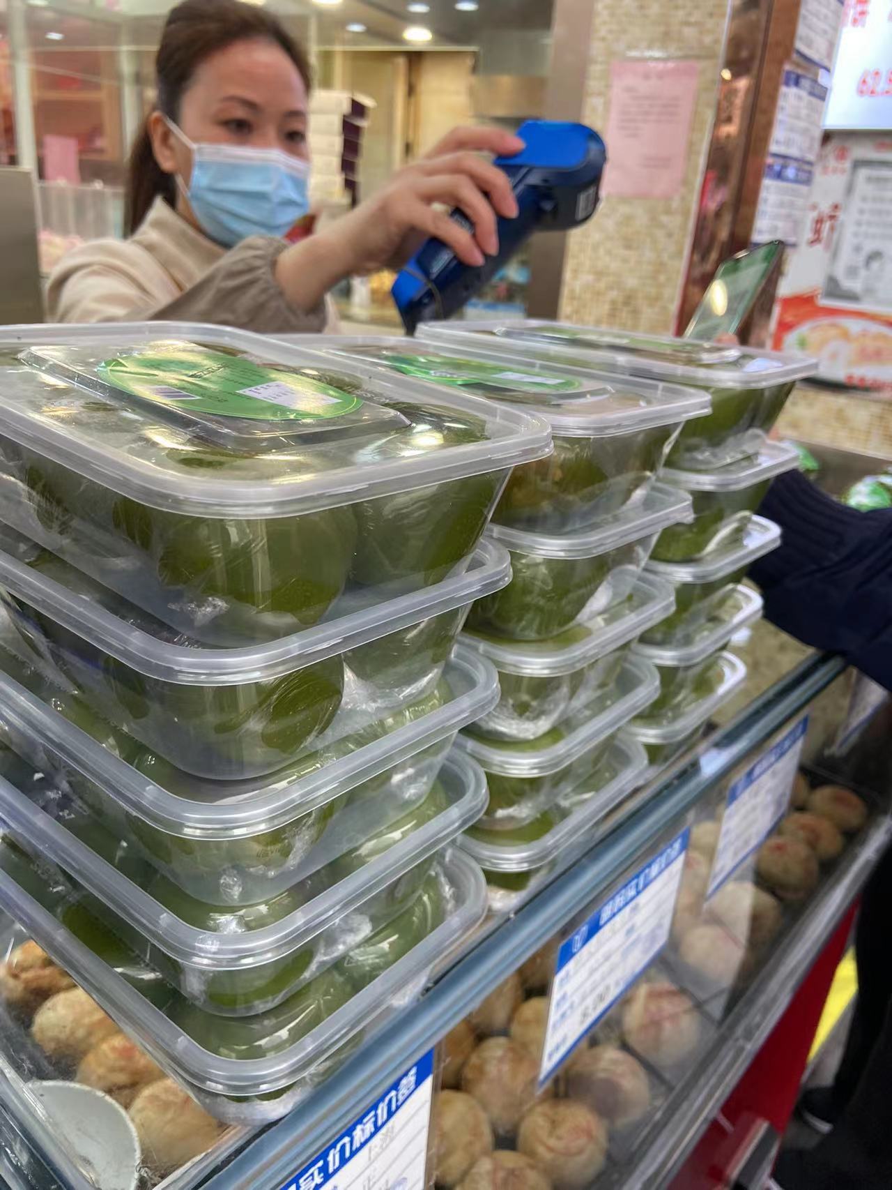 比起新雅和沈大成,真老大房的售卖方式可谓“简单直接”。原本摆放“鲜肉月饼”处,摞上一盒盒碧绿青团,只有咸蛋黄肉松和豆沙两种味道。来此购买的爷叔阿姨居多,“吃不惯新口味,每年都会来这买两盒咸蛋黄青团带回去。肉松与蛋黄混合,更加鲜香,这几年价格一直没变。”顾客李大爷说。