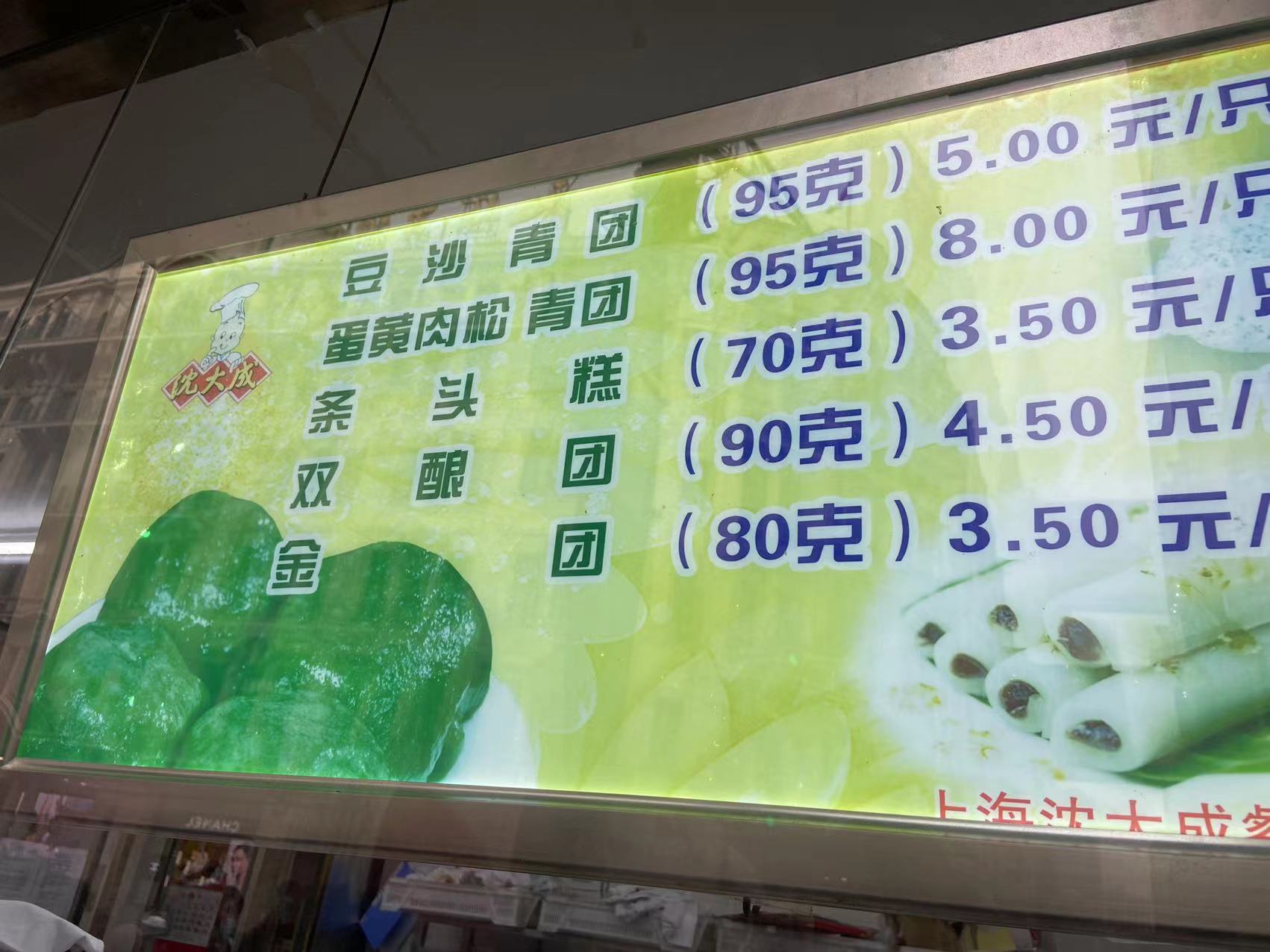 走过浙江中路,转角处便是以糕团闻名的沈大成。有人说,创建于光绪元年(1875年)至今已有140余年的沈大成,门口永远不缺排队者,今日一见,果不其然。与新雅不同的是,沈大成除了青团,还有金团、条头糕、双酿团等,价格3.5到5元不等。“两个金团、两个豆沙青团再加两个条头糕。”这是许多顾客的标配。