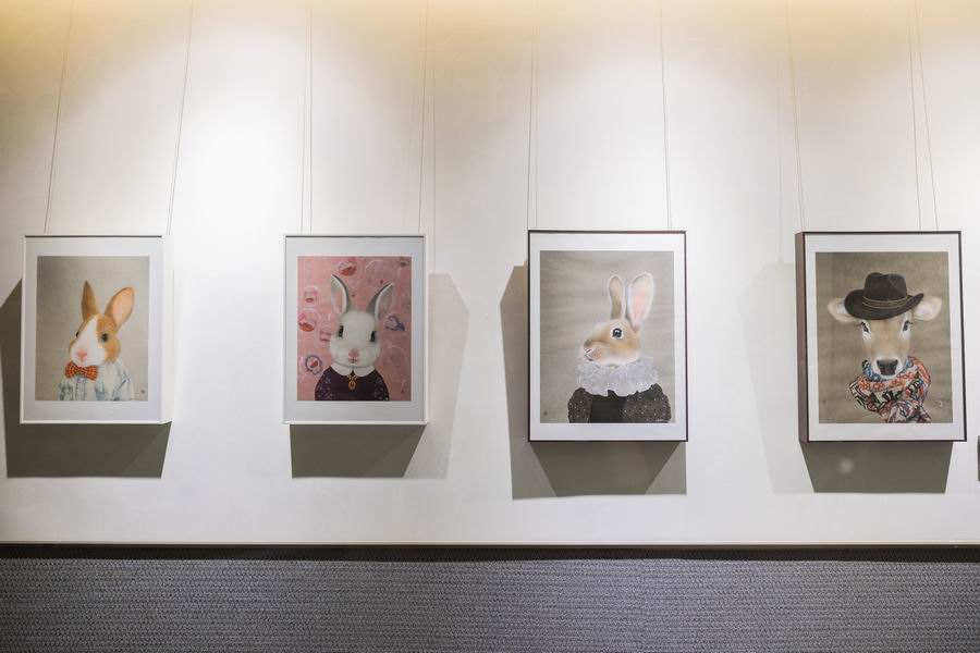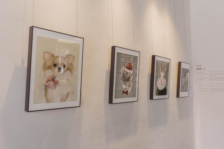 如果你在这个春日走进店内,将会遇见一些独特的“店员”。他们有的歪着头呆萌凝视,有的侧身45度正襟危坐;有的穿着欧洲中世纪贵族拜占庭风格的华服,有的却披上了哈利·波特同款的霍格沃茨魔法袍。这些可爱的小动物都出自青年艺术家李娜笔下。