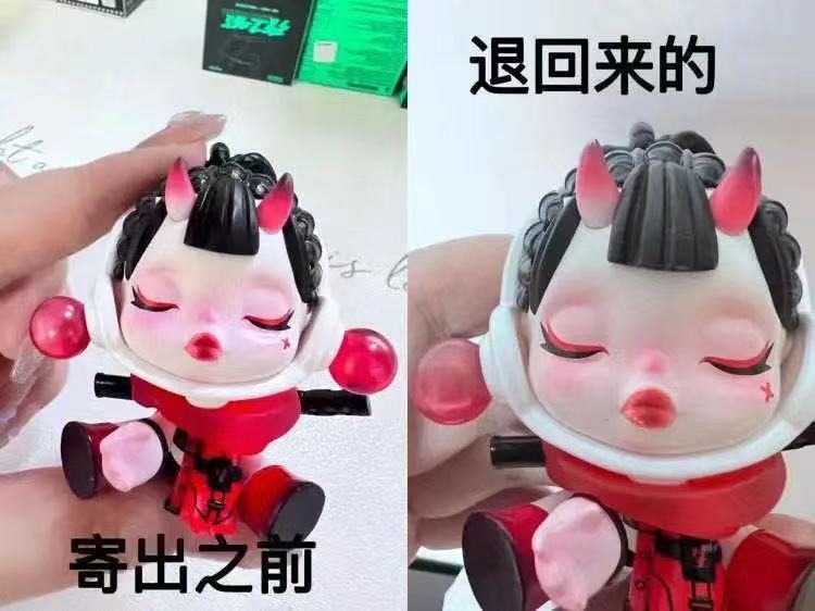 事后证明,他的决定是正确的。因为他发现,娃娃嘴边的黑色瑕疵不见了,取而代之的是嘴唇上的明显掉漆和手指的磨损——也就是说,被退回的“夜之守护”,很可能并不是他之前寄出的那一个盲盒娃娃。