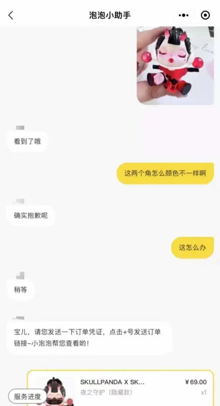 然而,不少在泡泡玛特官方平台抽中“夜之守护”的消费者却高兴不起来:因为抽中的“夜之守护”盲盒有瑕疵而申请售后换货,却被泡泡玛特客服人员告知,“与正品不符”,进而拒绝换货。