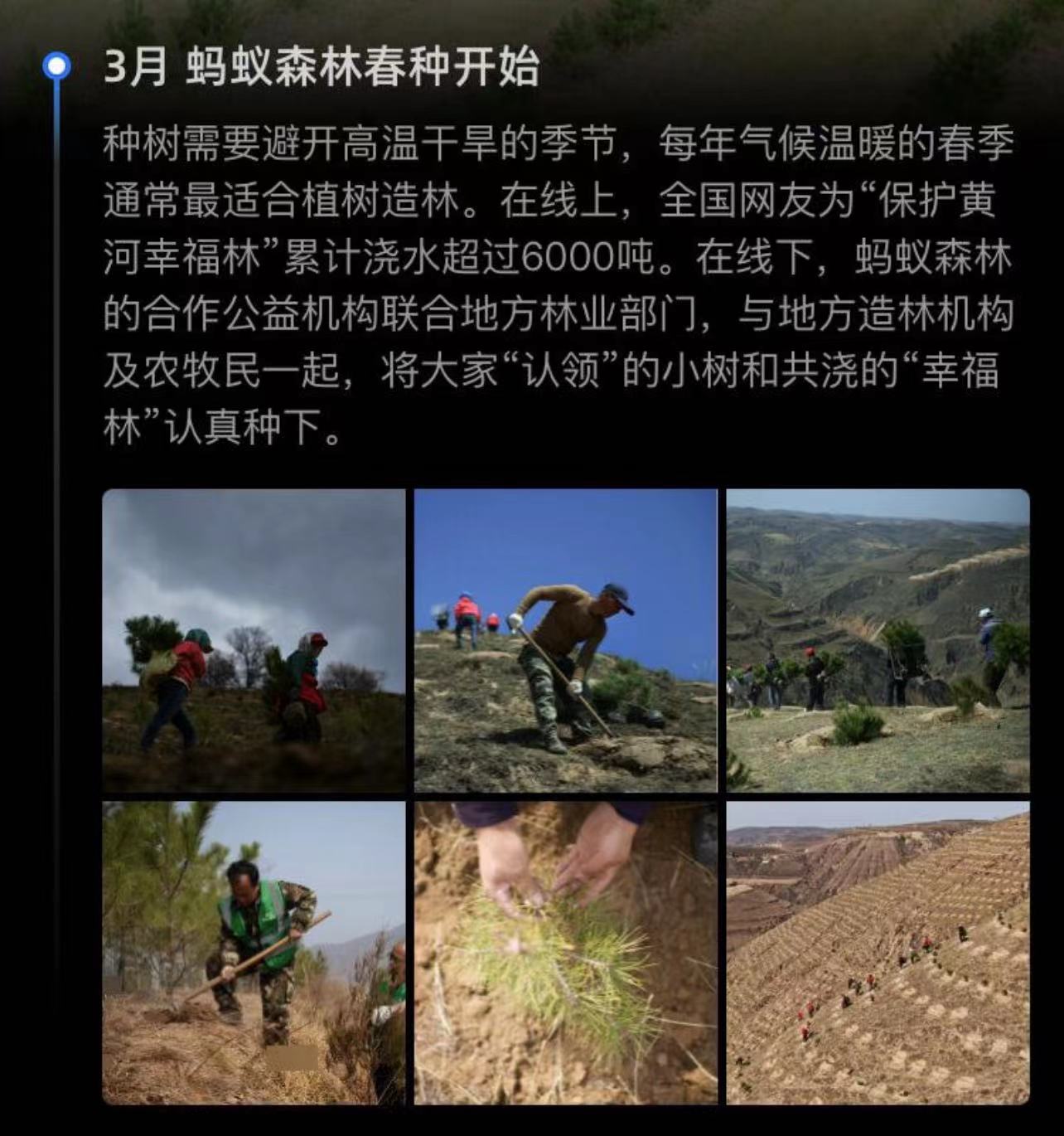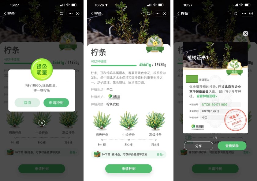 今年植树节前夕,笔者也用1.6万克“绿色能量”认领了一棵柠条。三月春种开始,就可以看到自己认领的小树的种植进展。