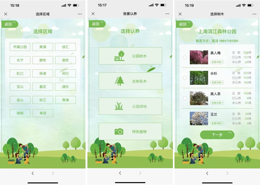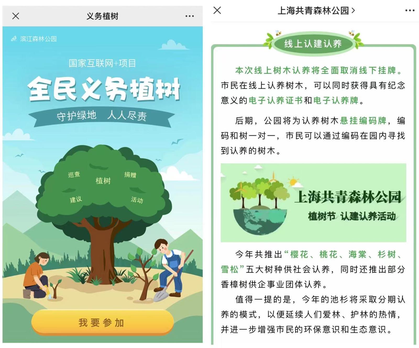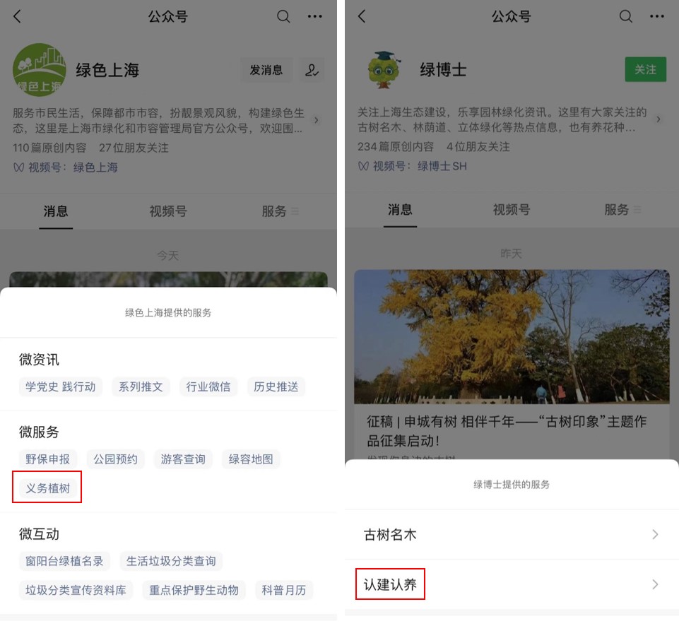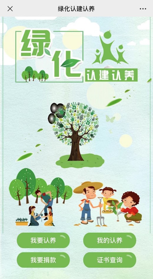 (1)登录“绿色上海”、“绿博士”微信公众号,进入“义务植树”、“认建认养”页面。