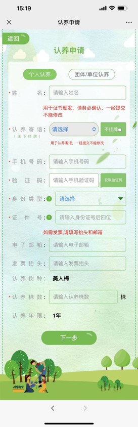 第四步:填写认养申请,然后点击下一步,并在线付款即可。提交时,务必按操作提示留下个人或单位的准确信息。完成付款后,您可以点击“认建认养”—“我的认养”,输入正确的手机号码查看认养信息。