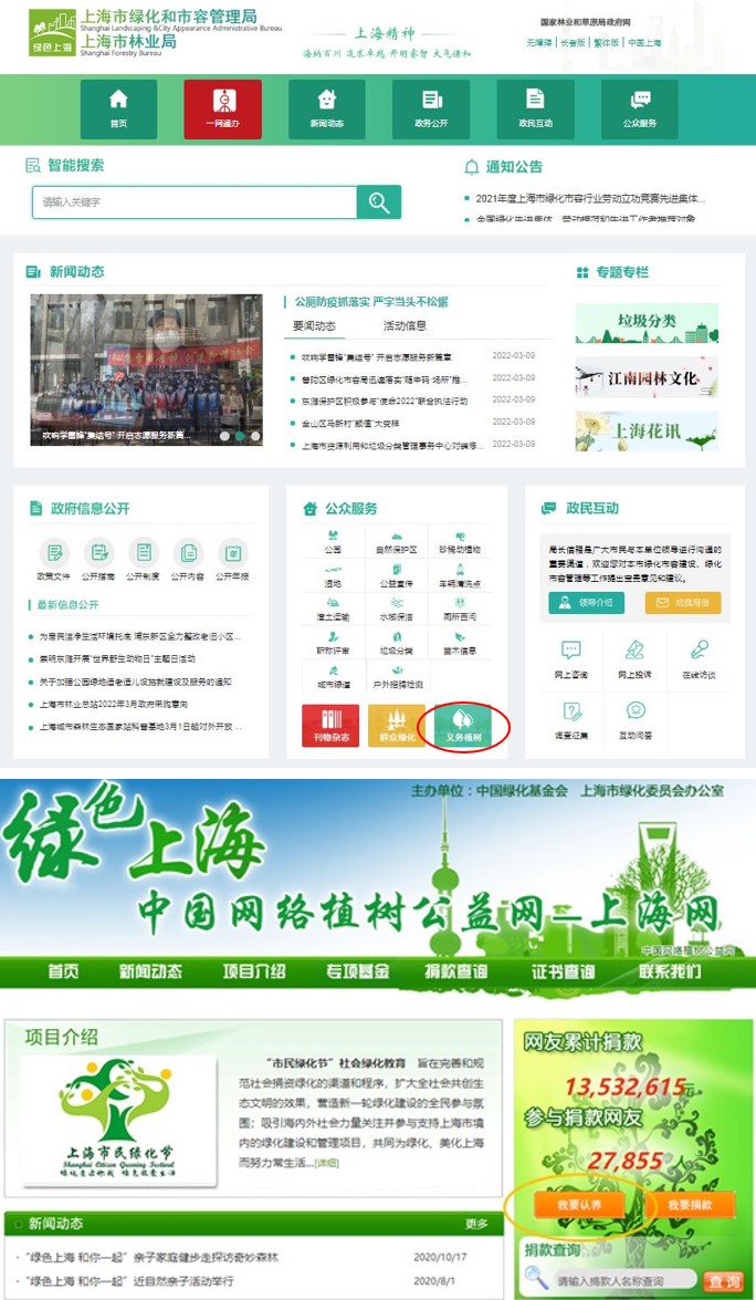 (3)登录网页端:上海市绿化和市容管理局、中国网络植树公益网——上海网,进入“义务植树”、“认建认养”页面。