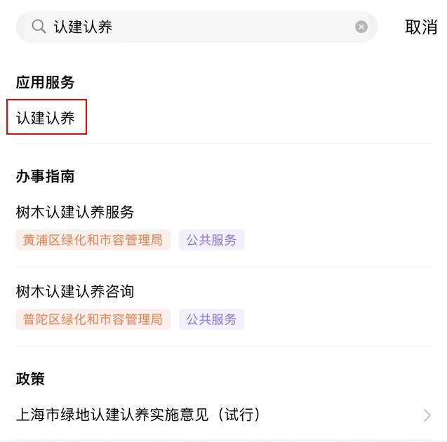 (2)登录“随申办市民云”APP,在搜索栏内输入“认建认养”字样进行搜索。