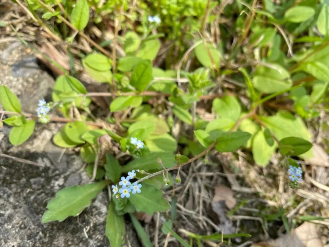 婆婆纳的花已经够小了,附地菜Trigonotis peduncularis的花还要小上一号,只有三四毫米大,想要拍清楚就得趴地上用微距镜头。其实细看附地菜还是很精致的,花冠喉部有5个黄色的附属物。紫草科很多花都长这样,若要细分得看果的形态了。