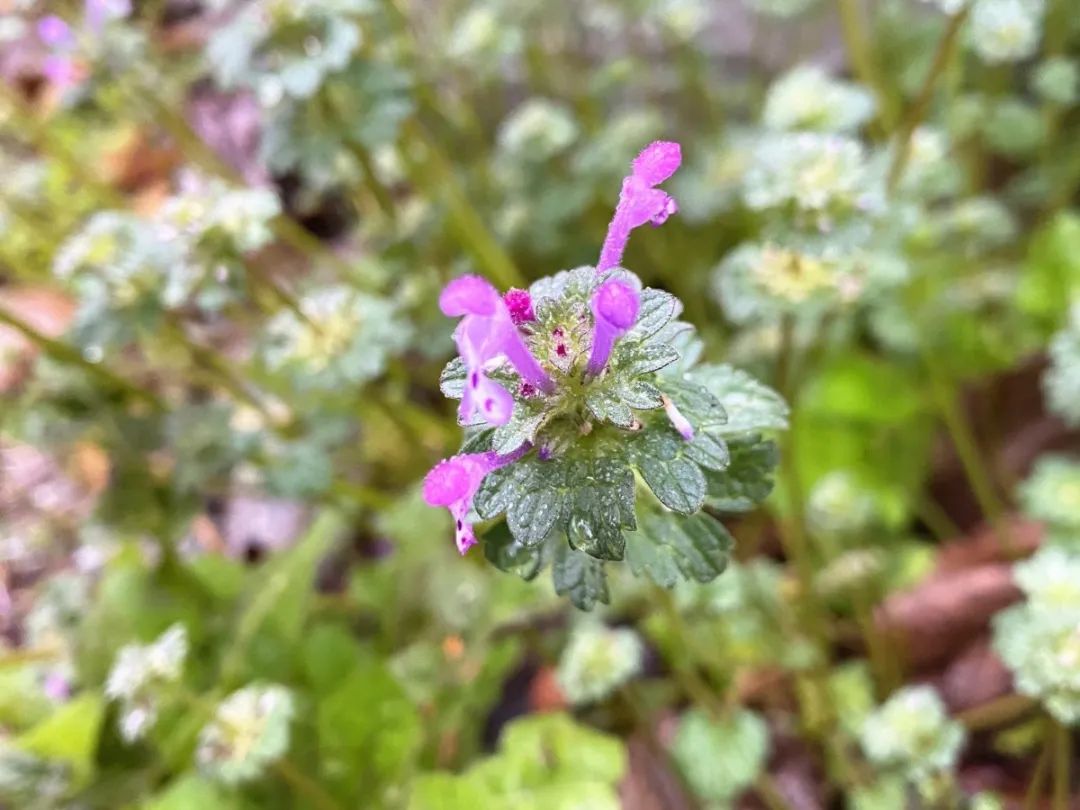 宝盖草Lamium amplexicaule的叶子层层叠叠如亭台如华盖,因而得名。自然界中大多数花朵是靠昆虫传粉授粉,宝盖草却有非常有趣的闭花授粉现象。早春气温较低昆虫较少时,花冠在早期的发育阶段就凋零了,此时会利用自体花粉完成受精过程。等气温回暖后再逐渐开出正常花朵,花冠紫红色。