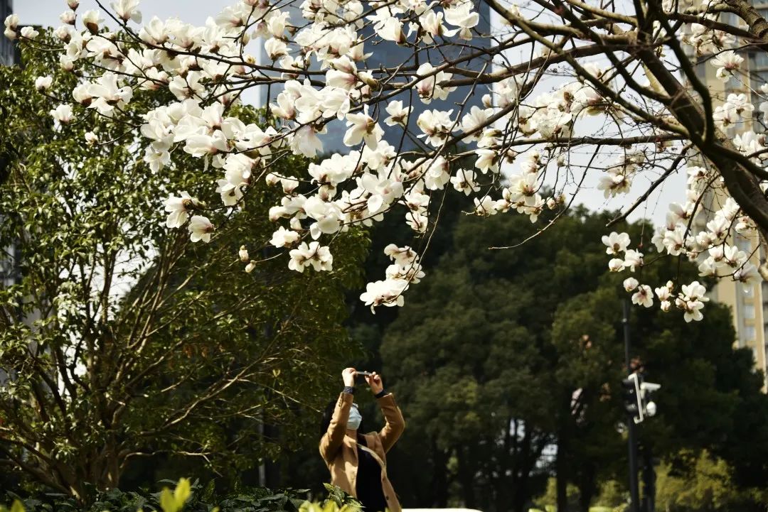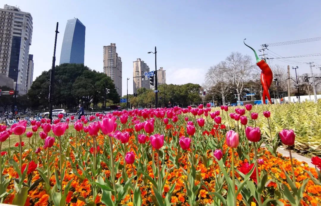 由西向东,在愚园路“入口”的鼎植广场上,看到白色玉兰花,还有芬芳郁金香。