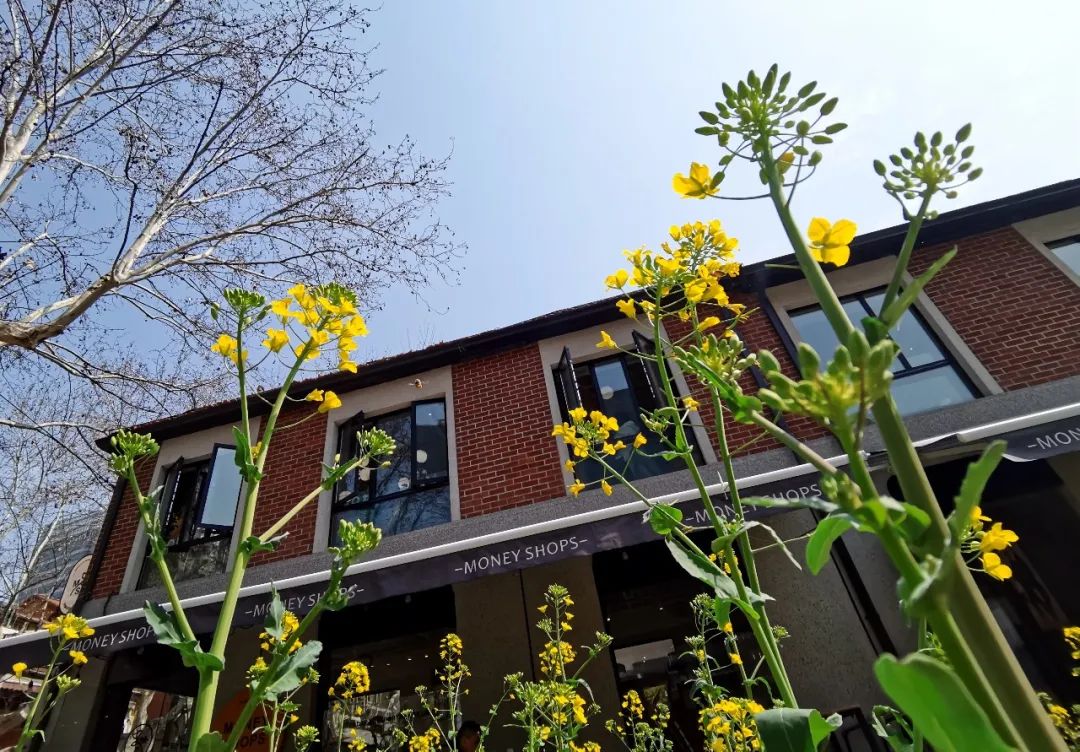 浪漫春日,愚园路“愚巷”的油菜花又开了,金灿灿的油菜花惹人喜爱。
