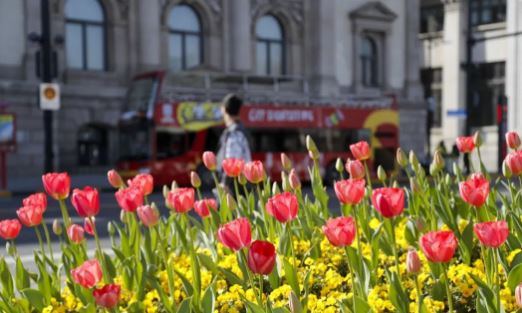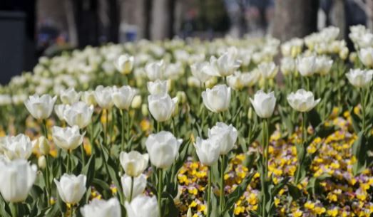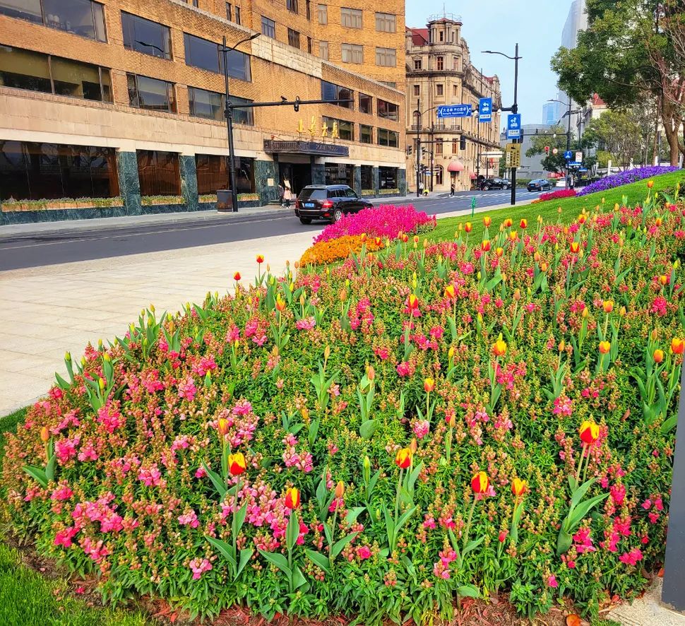 郁金香主要花色由红、粉、橙、黄、白、杂色等色系,除了常见的纯色系,一些双色的郁金香都属于稀有品种。而外滩沿线种植的郁金香多达15个品种,沿途花坛、花箱共计使用了7万株郁金香。