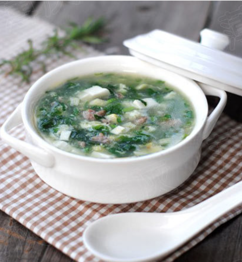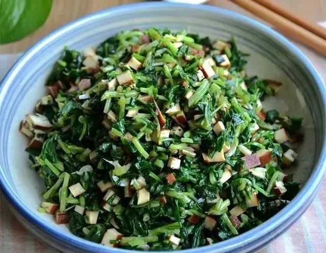 ·将荠菜用开水绰烫一下,捞出攥干水分,然后将冬笋切碎、豆腐切丁。