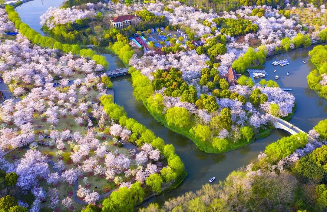 为了使樱花景观色彩更丰富、花期无断档,通过品种调整和布局优化,顾村公园的樱花景观已形成了一步一景、步移景异的特色:一条蜿蜒2000余米的“最美樱花大道”串联十大赏樱景点。