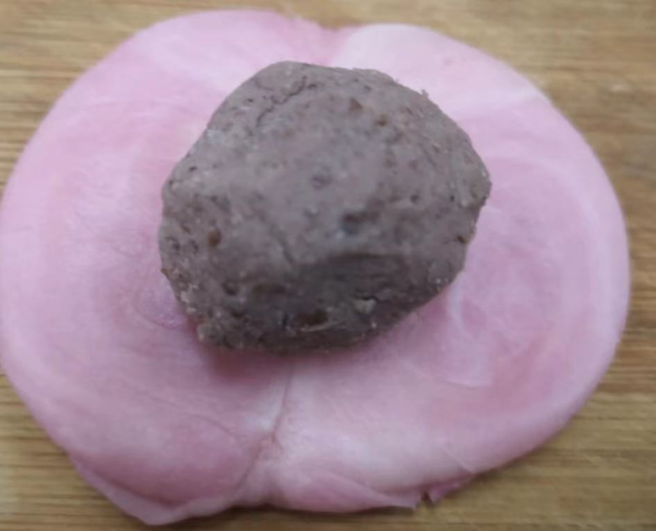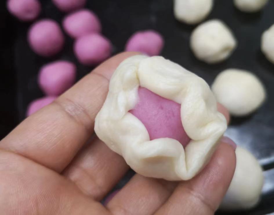 7. 将静置好的面团擀薄包上一份红豆沙团。
