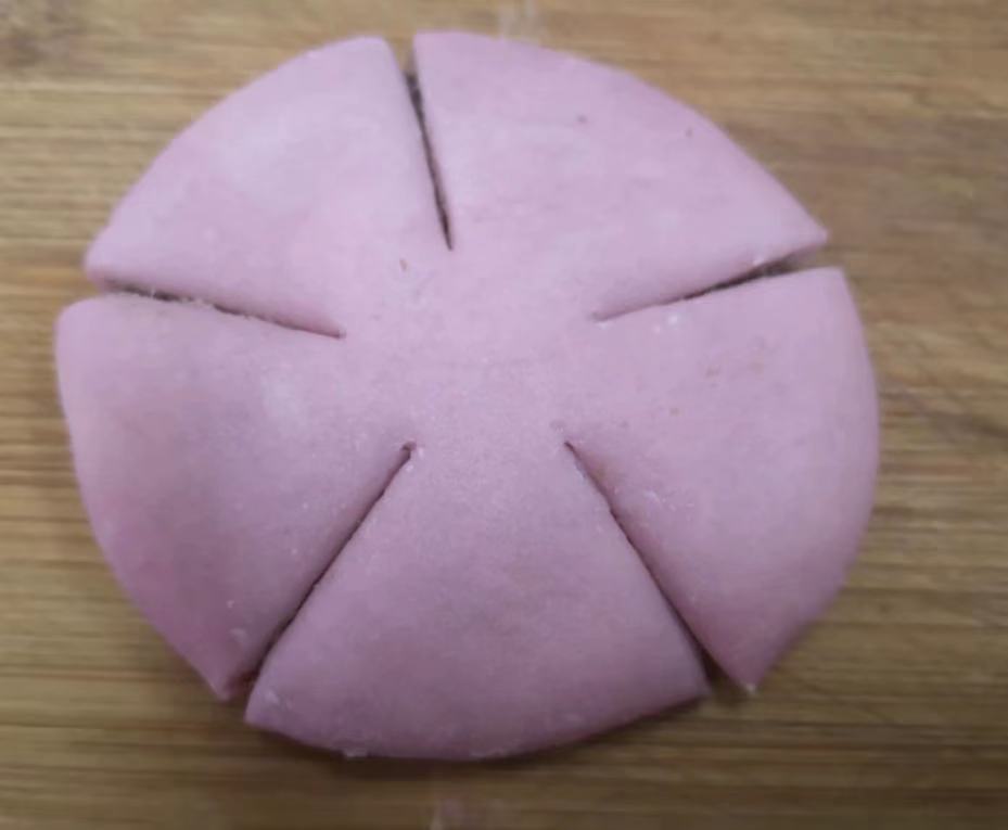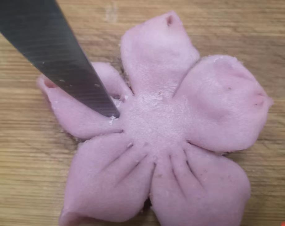 8. 将包好的面团压扁稍微擀薄一点,用小刀平均切,分出5个花瓣,注意留出花心的位置哦,用大拇指和食指捏出花瓣的形状。