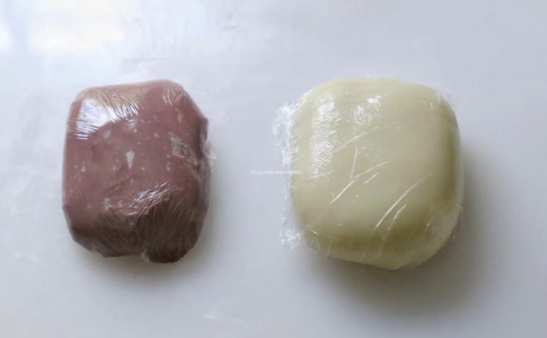 2. 将油酥材料混合揉成团,并加入一点红曲粉调色,也放进冰箱。
