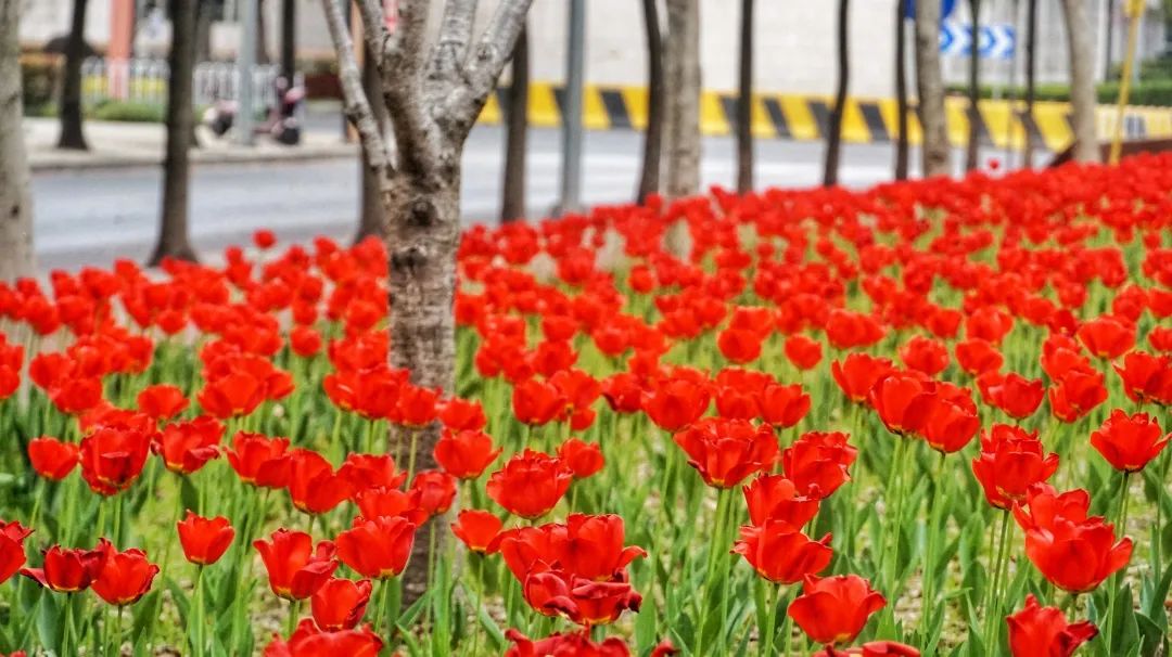 一片郁金香花海跃然于眼前,鲜艳夺目的花朵,像春天的使者,明艳迷人。