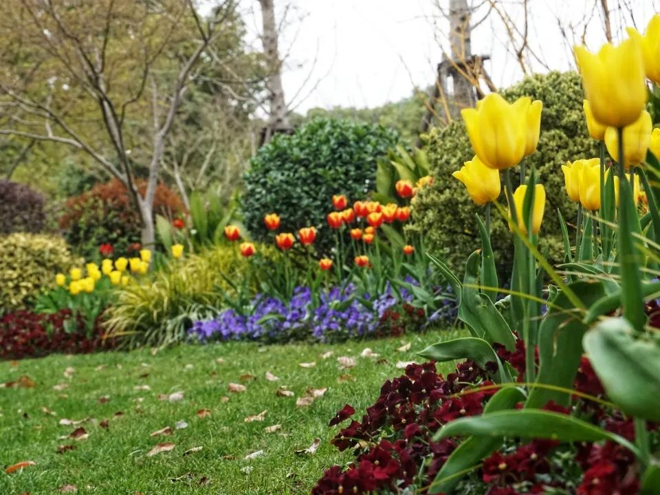 移步换景、一步一景,春风扶绿柳,百花立枝头。生机勃勃的花儿,风中摇曳的柳树,温暖湿润的水汽仿佛要扑面而来。