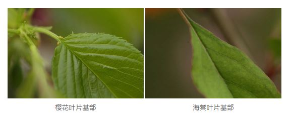 先看花瓣尖,有缺口是樱花,无缺口的是海棠;无花看叶片,先花后叶是樱花,花叶同放是海棠;双保险看叶基部,樱花叶基两腺点,海棠叶基则没有。