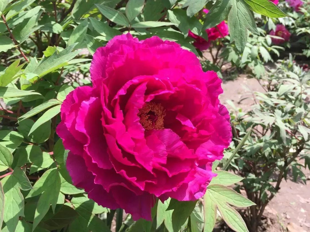 百园红霞牡丹花色为艳丽的紫红色,花型是皇冠蔷薇型,花大色艳花量多,看起来高贵大气。