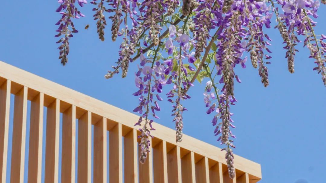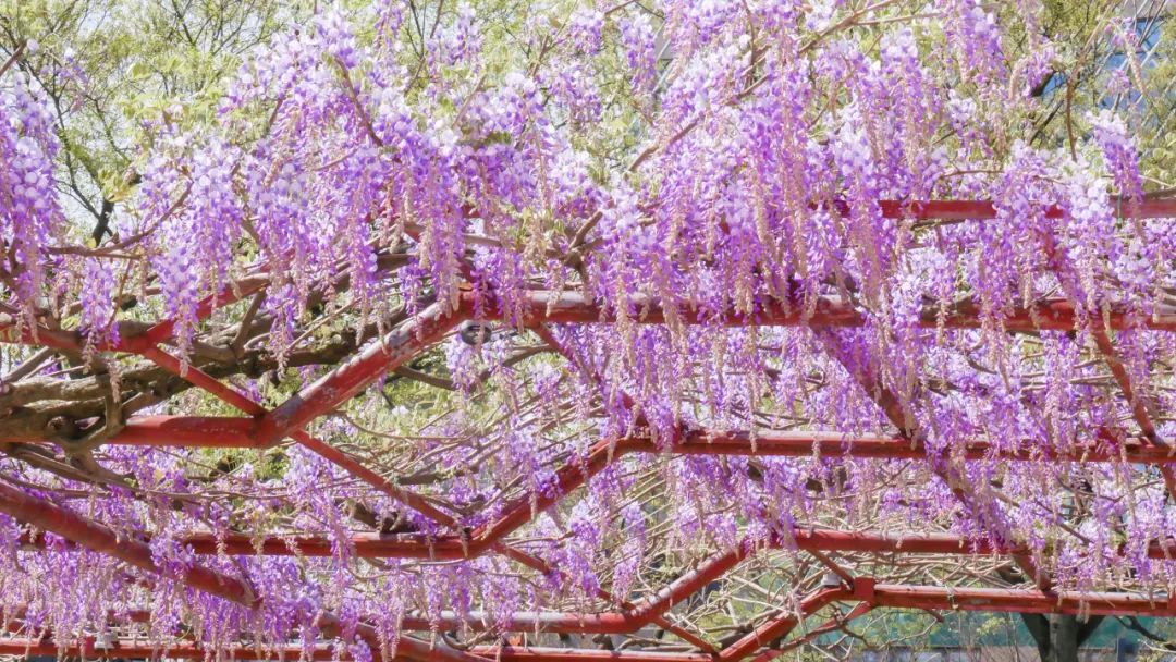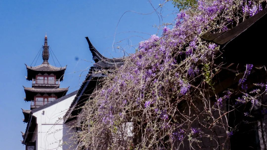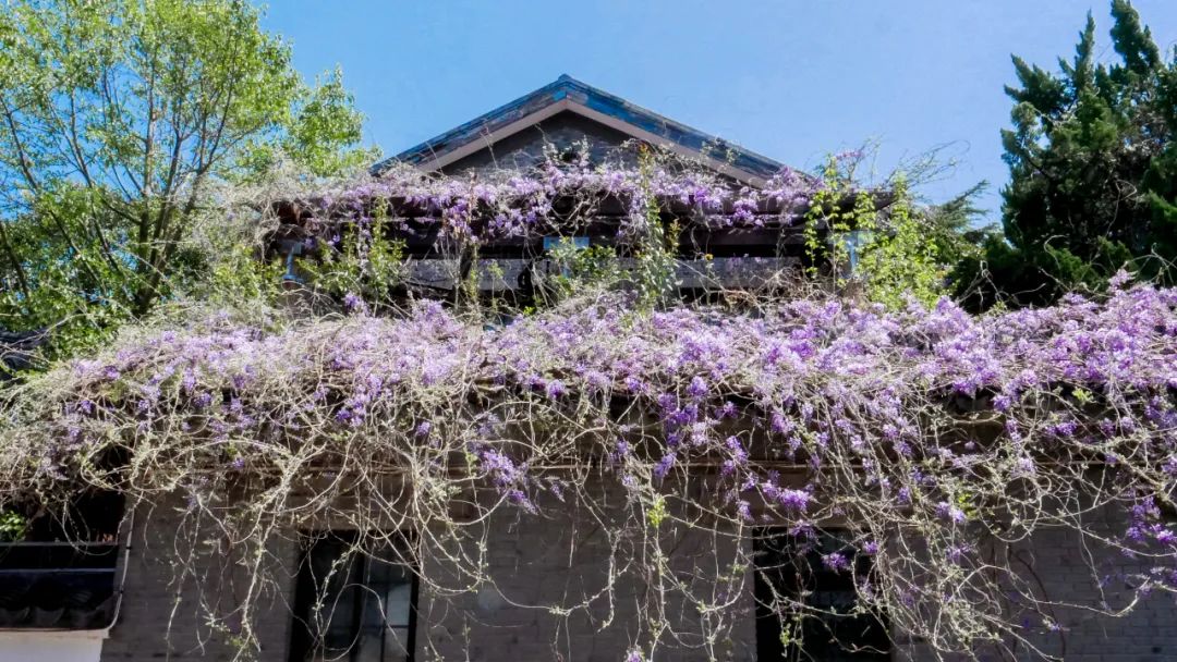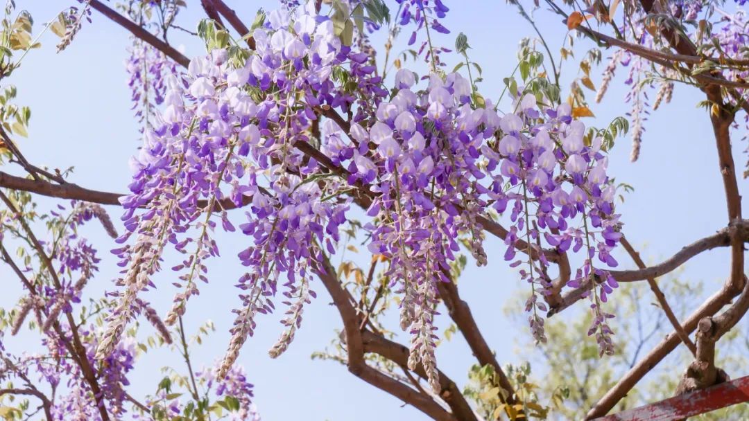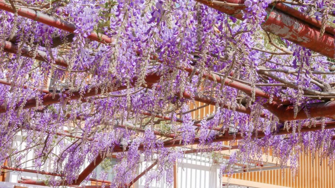 近几日天气晴好、气温升高,紫藤积蓄了整个冬天的力量也喷薄而出,在棚架、屋檐之上悄然绽放,一起跟着镜头感受这份春意。