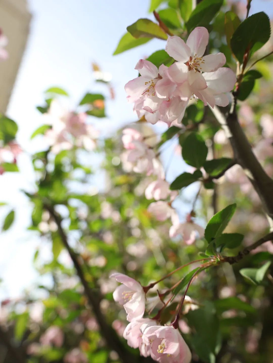 站在阳台上,看到楼下的海棠花正茂盛开放,春景正好。