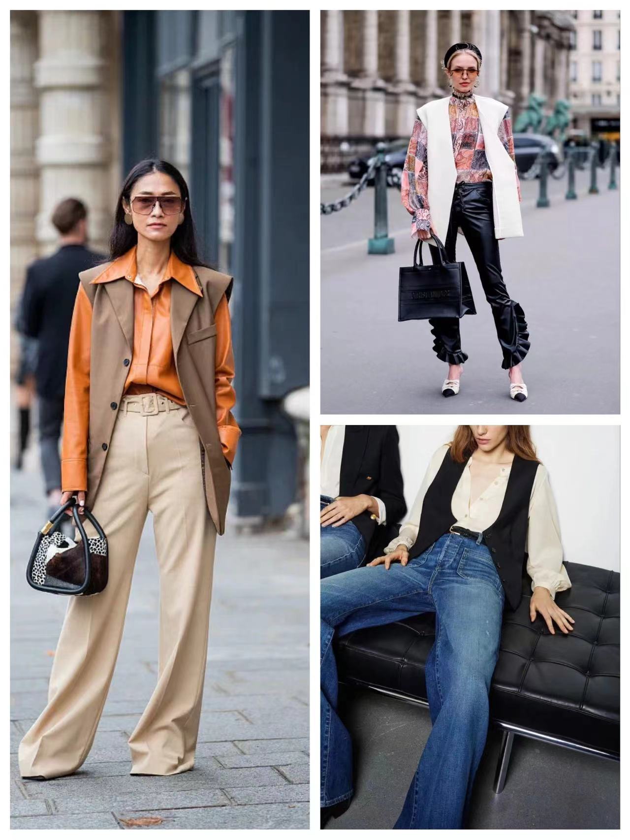 西装马甲和皮马甲相比针织马甲来说更为成熟一些,但利落大方,更硬朗、更有线条感和立体感,搭配牛仔裤或阔腿裤,酷帅十足。