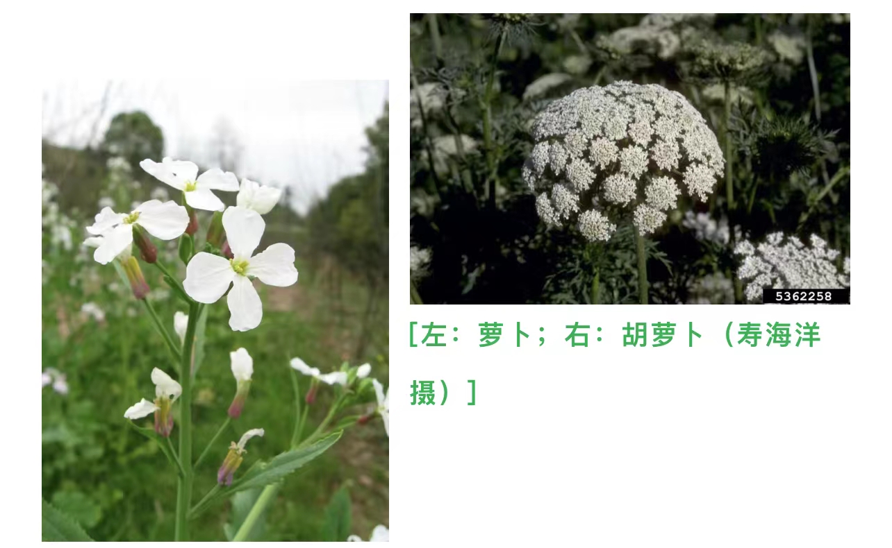 胡萝卜虽然名字中有“萝卜”二字,但是它和我们食用的萝卜可谓八竿子打不着。两者在分类学上所处的科、属都不同——萝卜是十字花科萝卜属植物,而胡萝卜是伞形科胡萝卜属植物。如果说萝卜和大白菜是同一个楼栋里的邻居,那么和胡萝卜只能算是住在不同小区里认识的朋友了。看一下它俩的花,没有听说过植物分类学的人也能直观地感受到它们的关系有多远……