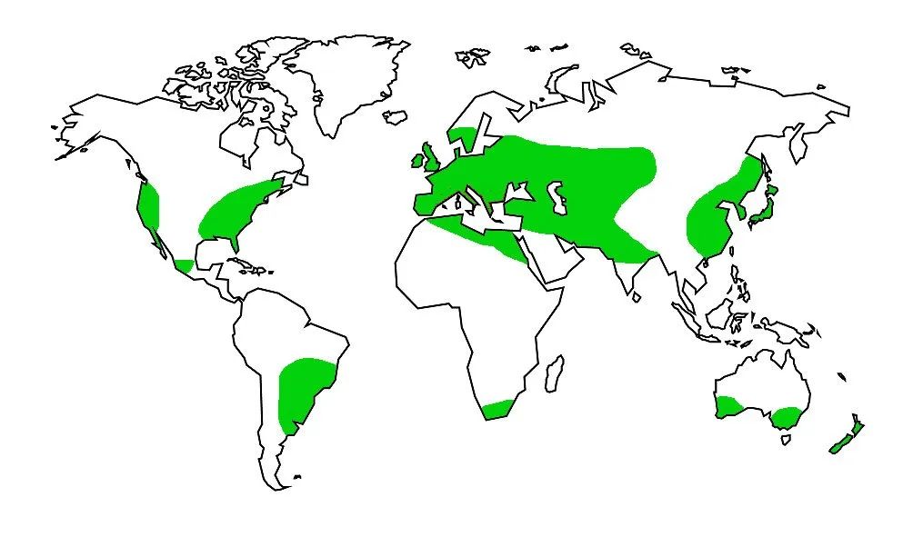 绿色区域为世界上胡萝卜的主要栽培区(来自carrotmuseum.co.uk)