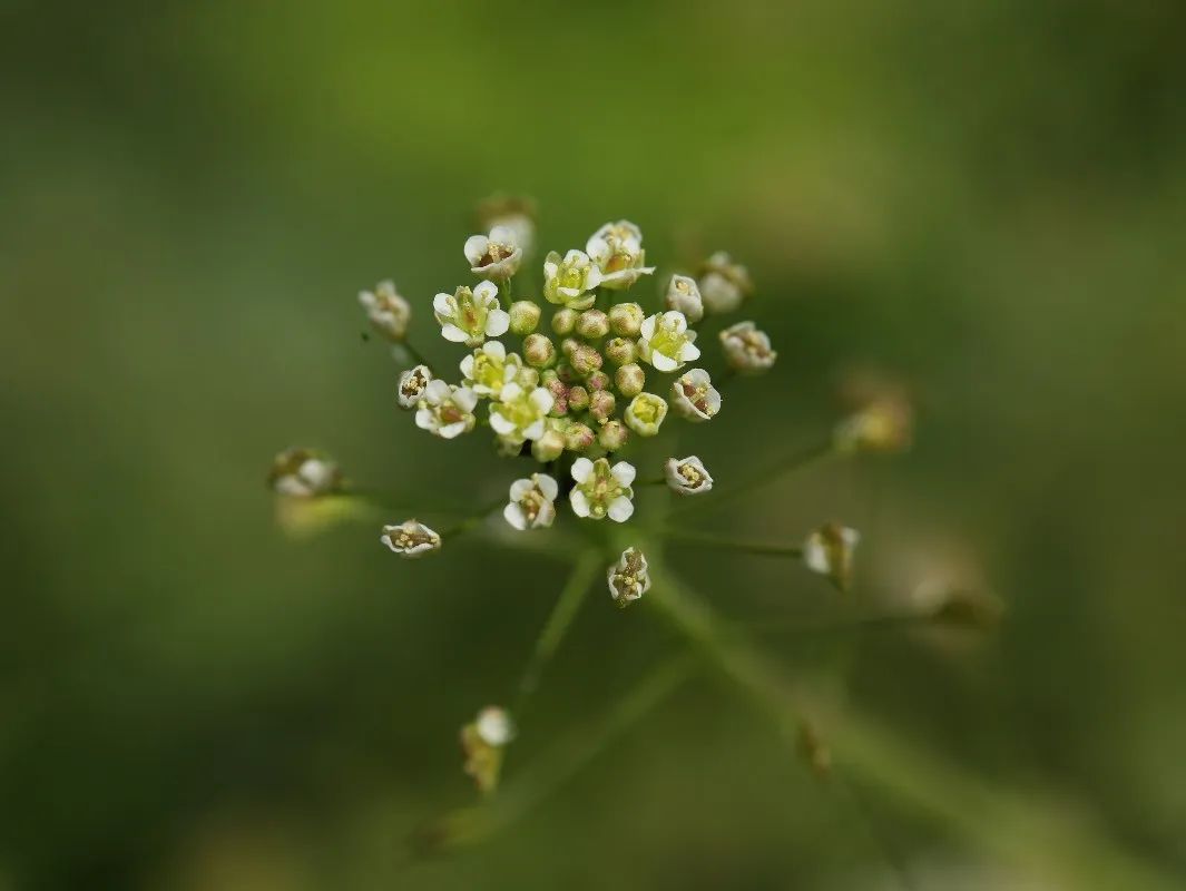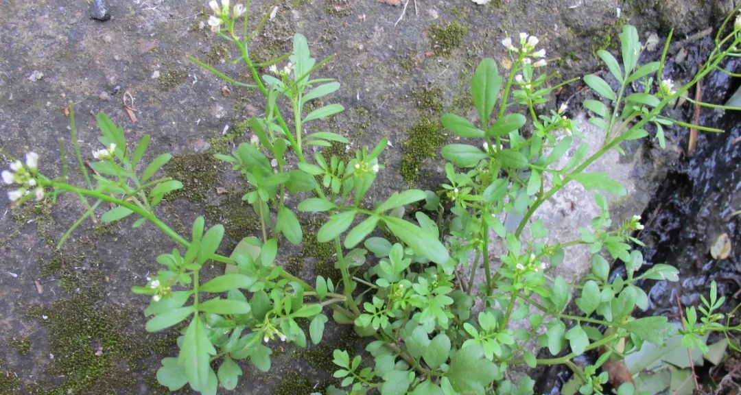 碎米荠俗称野荠菜,上海郊区民间叫白带菜。因为来自于同一家族,碎米荠的植株大小和花都与荠菜十分相像,但您仔细瞧就会发现差别:
