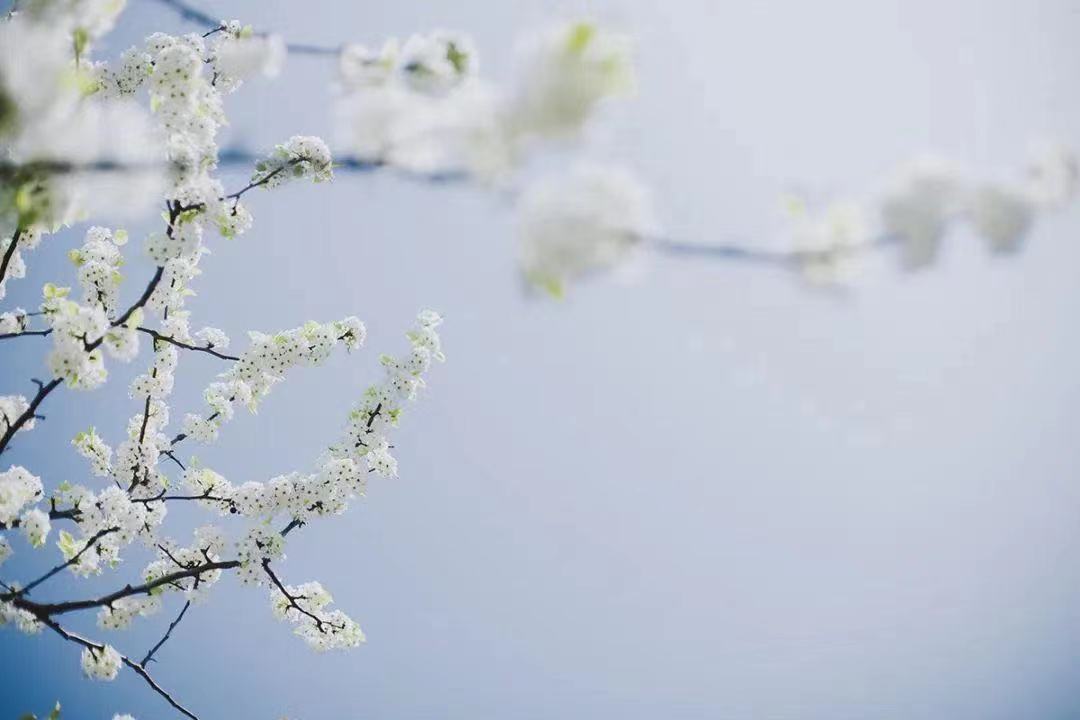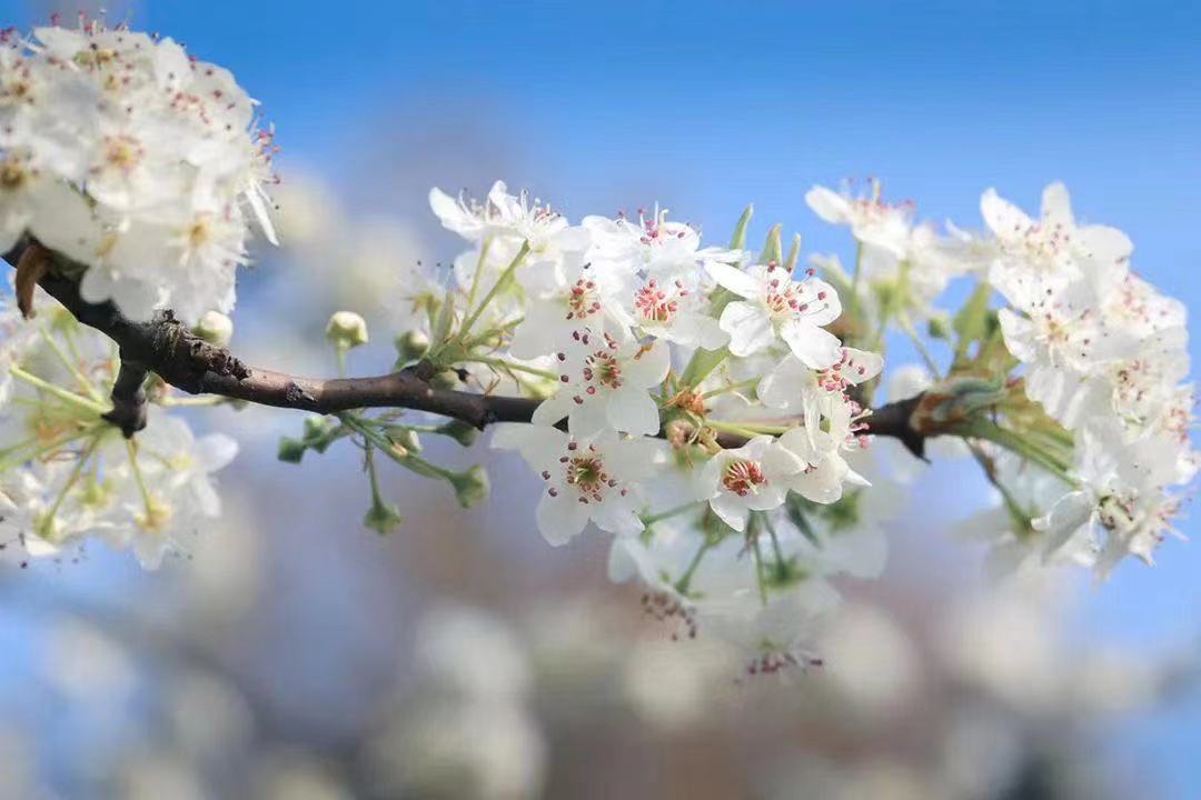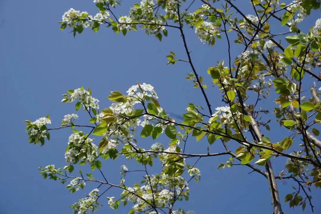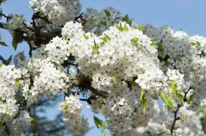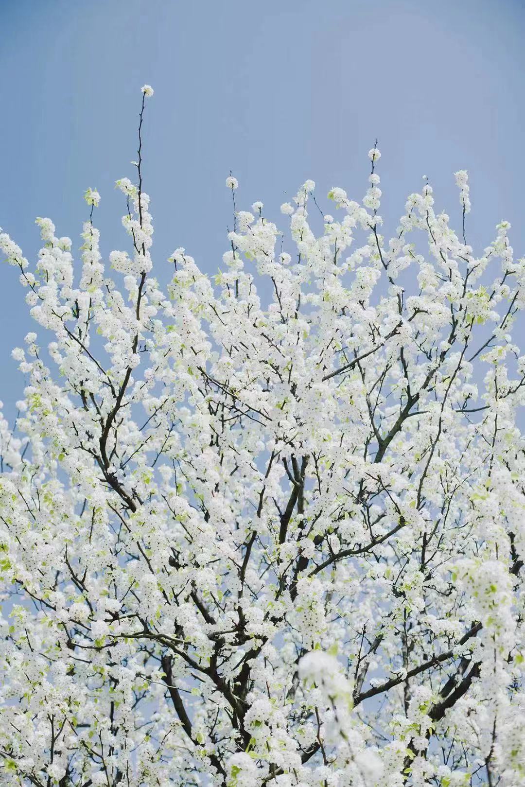 豆梨开得密密匝匝,美丽的白花映入眼帘,完美诠释了“昔去雪如花,今来花似雪”的场景。