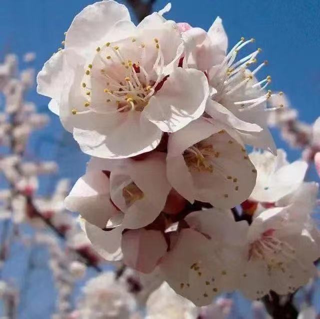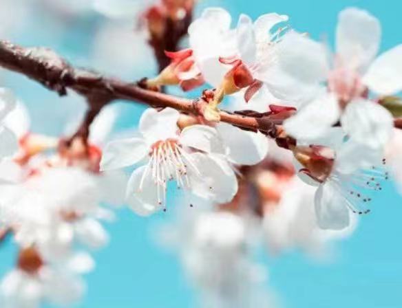 蔷薇科杏属和桃属比较相似,很多人会把杏认成桃花。杏花单生,先于叶开放,开花时通常不见叶片,在阳光的沐浴下,杏花正在盛放。