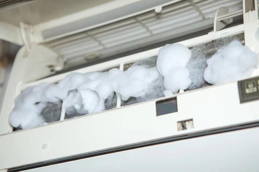 使用清洗剂清洗空调后,应用清水将翅片冲洗干净以防翅片被腐蚀生锈,并开启空调半小时以上,将清洗剂的残留物自动排除到机体以外。