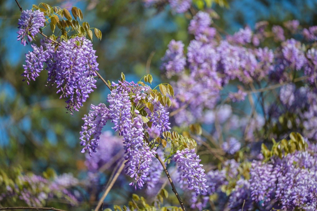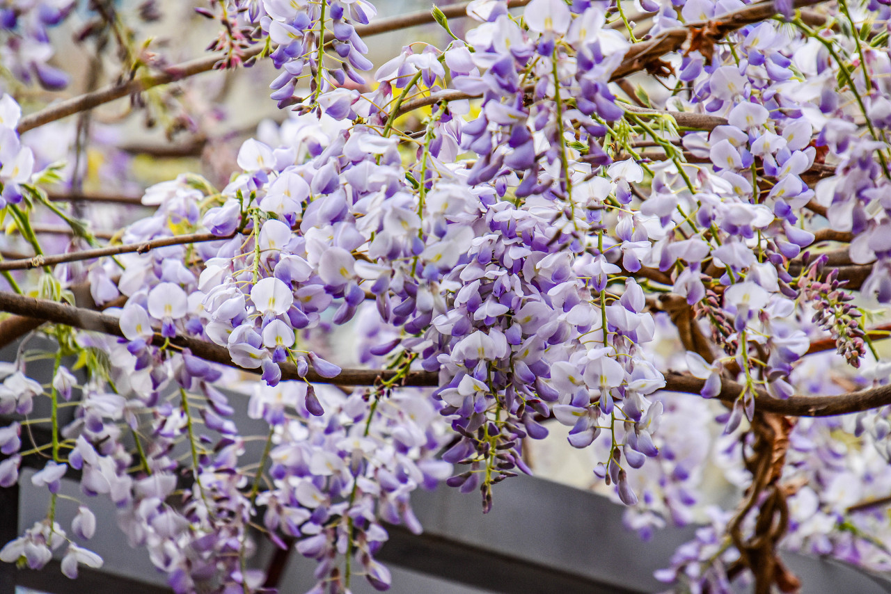 闵行区临沧路古藤园内的古紫藤,至今已近500岁,是申城最古老的紫藤,因诗人董宜阳手植而得名。相传乾隆皇帝下江南时,曾拴马于此古藤下,于是这株古紫藤又冠以“拴马藤”的称号。为保护这株古紫藤,古树管理部门为其营建了古藤园,开展了藤架更新、枯枝修剪、病虫害防治等工作,复壮了古紫藤长势。“紫藤挂云木,花蔓宜阳春。密叶隐歌鸟,香风留美人。”只见古藤园内的古紫藤盛情绽放,紫中带蓝,灿若云霞。