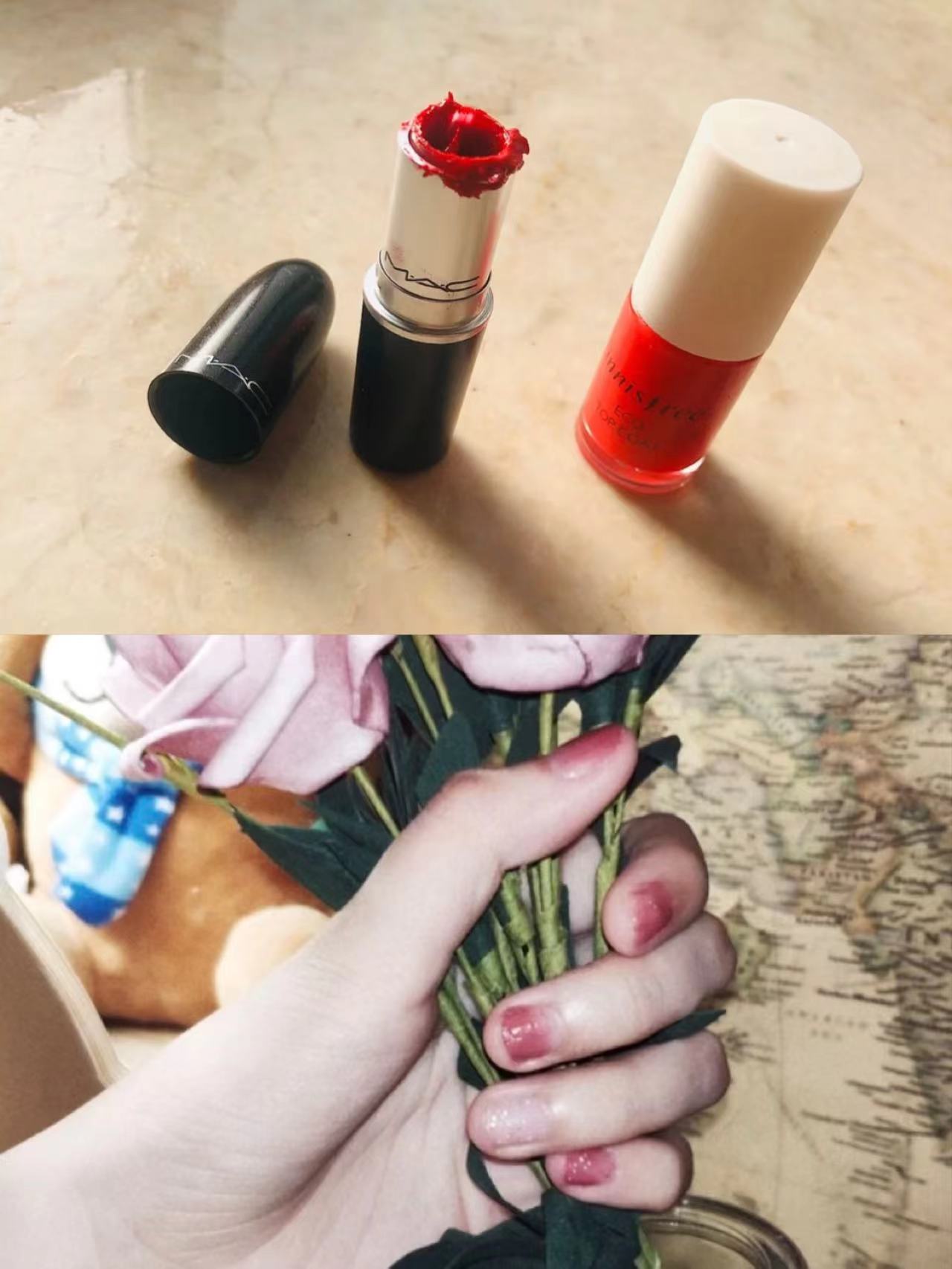 将口红膏体隔热水融化,倒入无色指甲油内,搅拌混合。先上底油,再用棉签蘸取口红涂指甲上,颜色超级独一无二!