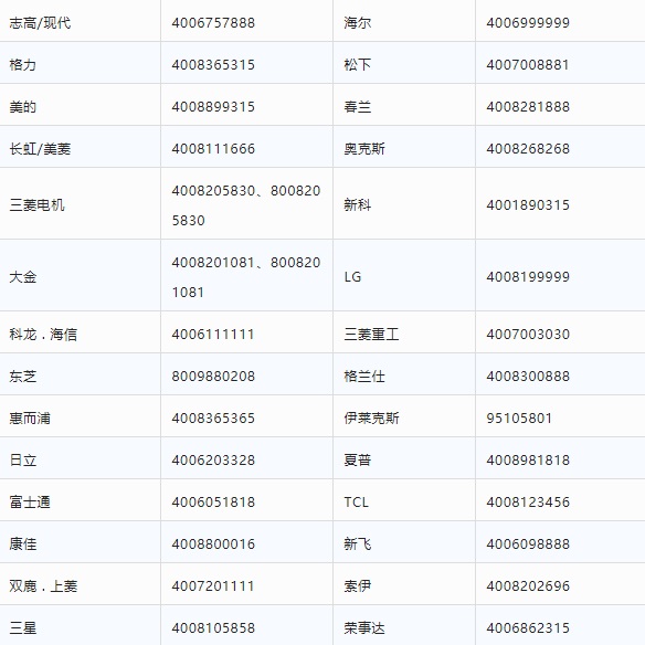 还有问题?以下是整理的各类空调品牌厂家的400电话: