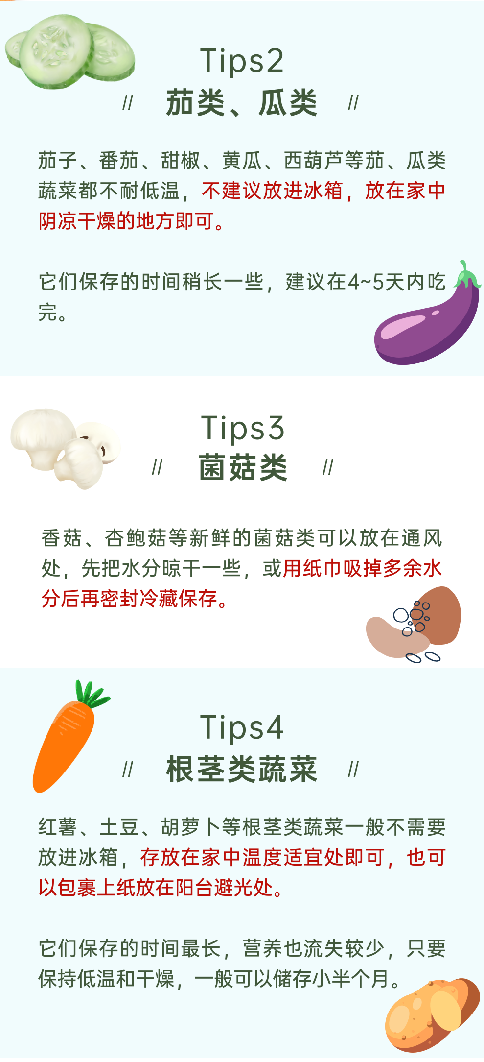 茄子:茄子也怕冷,它的最佳储存温度是10~12℃,对于北方来说存放在阴凉的阳台即可,2~3天吃完。