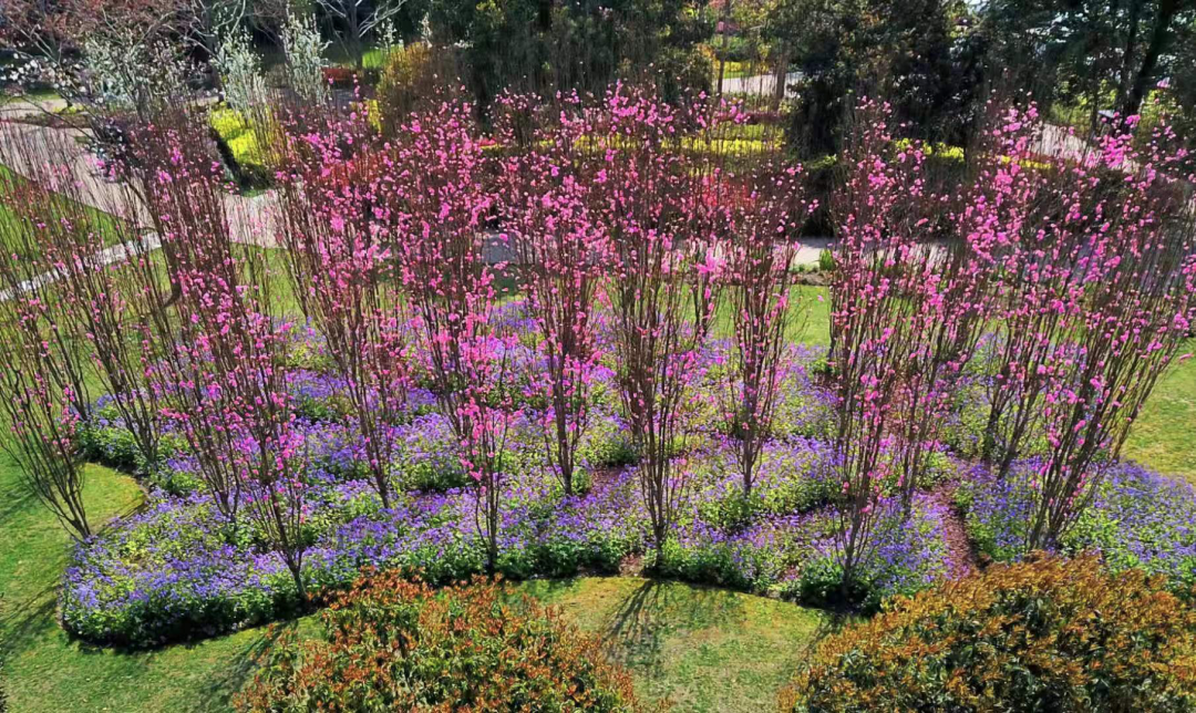 在后期养护上,根据植物生态习性进行修剪,打造优美的树形,调整开花时间,增加花量和开花次数;通过适时、适量的水肥管理和绿色无污染的综合防治方法进行病虫害防治,保证植物健康生长。