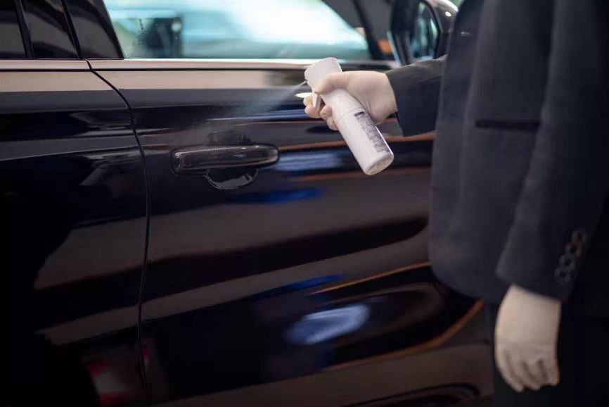 对车辆重点部位门把手可用75%的酒精擦拭,全面消毒后对车辆外部进行一次清洗。