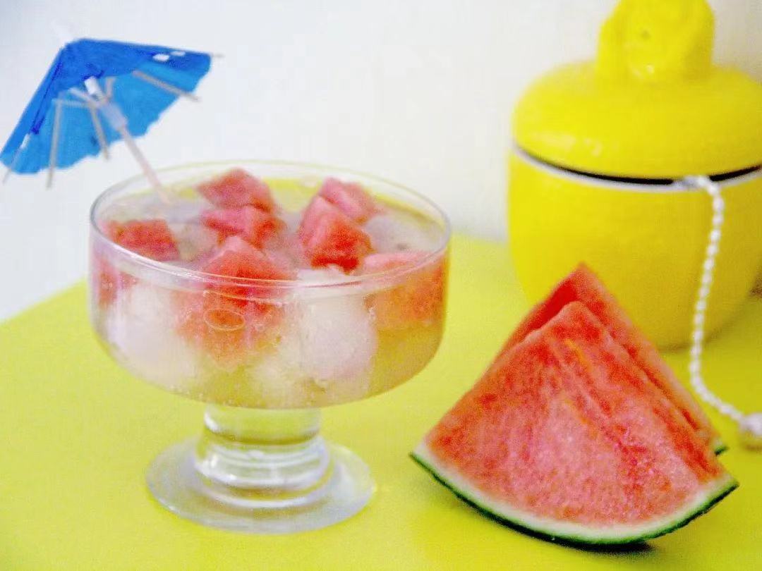 西瓜切小块,尽量去籽,取4颗冷藏好的荔枝,去壳并将荔枝肉撕成小块。
