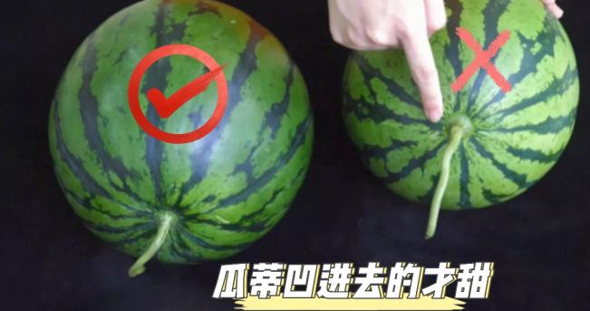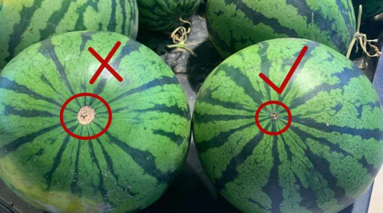 4、看瓜脐:西瓜成熟瓜脐有明显凹陷,收口小,而且整齐;