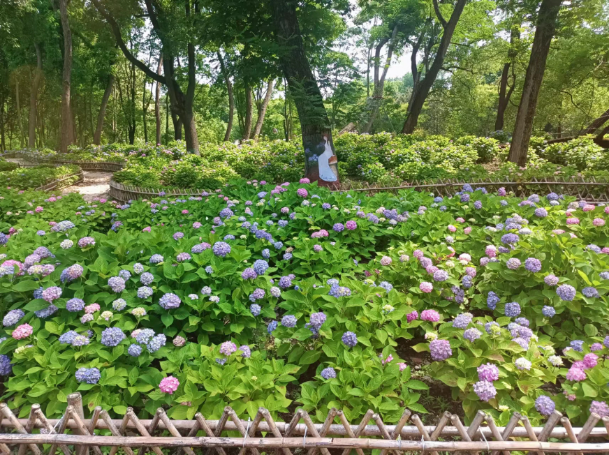 去年新打造的八仙花景观区域,近两千株无尽夏成片绽放,蓝粉相间,绚丽多彩,把夏日的森林点缀的格外梦幻。
